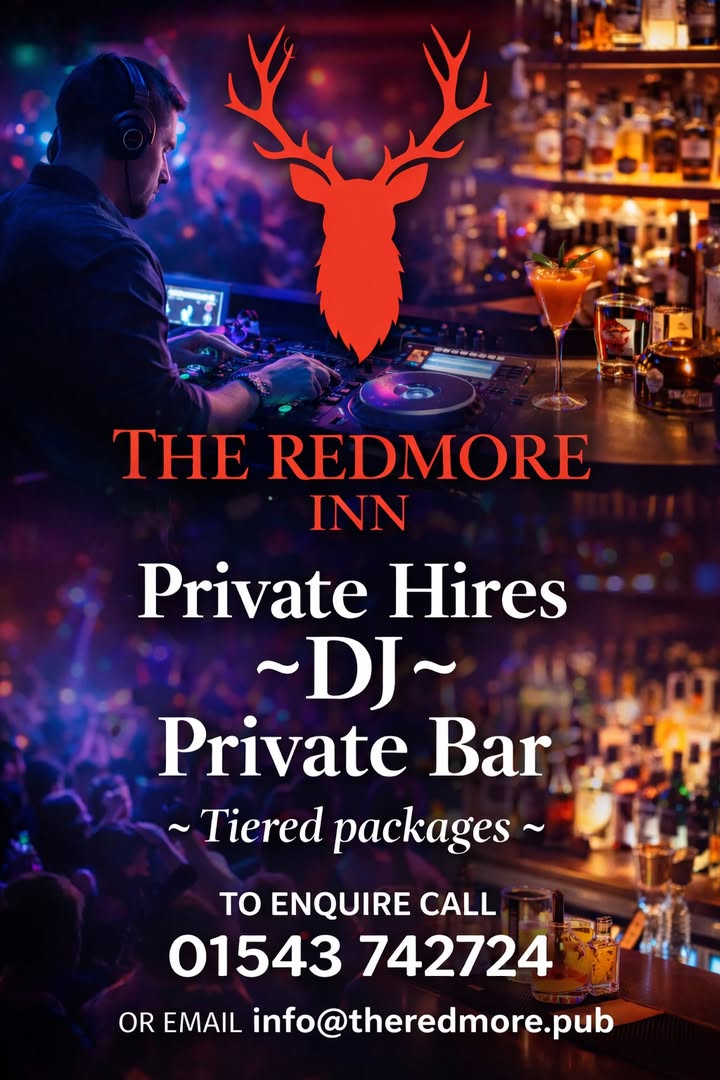 🔥 TURN UP YOUR CELEBRATION AT THE REDMORE INN 🔥 Private Hires | DJ Nights | Private Bar ✨ Tiered packages available ✨ Perfect for birthdays, work parties & weddings 💍 ✔️ DJ & dancefloor vibes ✔️ Private bar ✔️ Personalised decoration packages for weddings & special occasions From elegant wedding receptions to full-on party nights — we tailor the space to your vision 🎶🍸 📞 To enquire call: 01543 742724 📧 Or email: info@theredmore.pub 🎉 Book the space. Set the mood. Make it unforgettable.